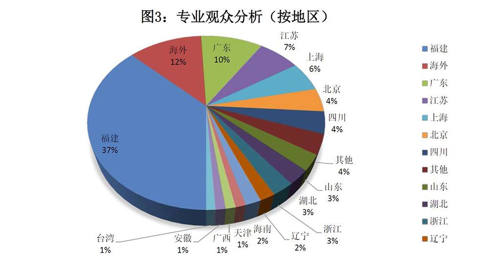 2016年亞太水產(chǎn)養(yǎng)殖展參觀觀眾近萬(wàn)名,包括3100多名專業(yè)買家。亞太展專業(yè)觀眾來(lái)自國(guó)內(nèi)25個(gè)省市自治區(qū),以及國(guó)際35個(gè)國(guó)家。國(guó)內(nèi)觀眾前五名的省市分別為:福建(37%)、廣東(10%)、江蘇(7%)、上海(6%)、北京(4%)。國(guó)際觀眾前五名的國(guó)家為:美國(guó)(17%)、新加坡(8%)、南非(7%)、摩洛哥(6%)、秘魯(6%)。如圖3所示。