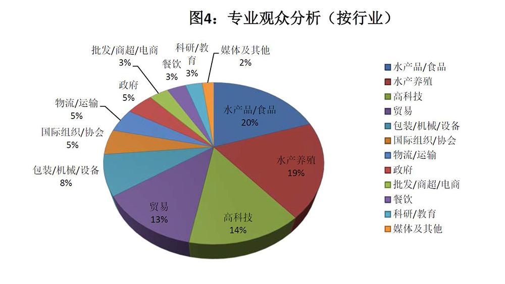 按照企業(yè)性質(zhì)分析,亞太展專業(yè)觀眾占比前五的企業(yè)類型為:水產(chǎn)品/食品企業(yè)(20%)、水產(chǎn)養(yǎng)殖企業(yè)(19%)、高科技企業(yè)(14%)、貿(mào)易型企業(yè)(13%),及包裝/機(jī)械/設(shè)備企業(yè)(8%)。